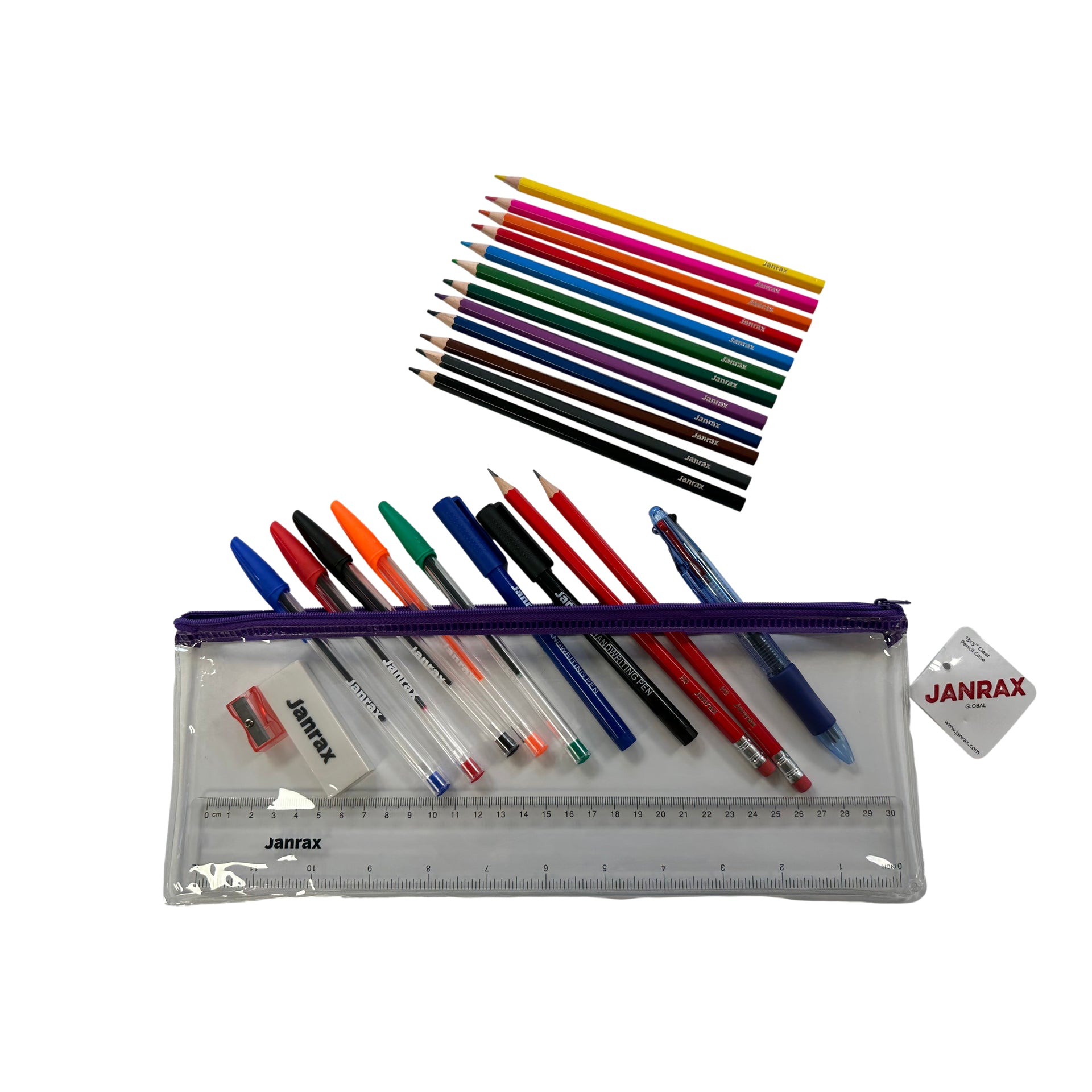 The Filled Purple Zip Clear Exam Pencil Case is a well-organised and durable study companion that comes filled with essential stationery products. It includes 2 HB pencils, 4 in 1 colour pen, 5 assorted ballpoint pens, 1 blue ink handwriting pen, 1 black ink handwriting pen, a 15cm ruler, a quality PVC eraser, a pencil sharpener and 12 colouring pencils. The transparent design allows you to easily see and access the stationery. Whether you are a student gearing up for exams or a professional seeking efficiency, this pencil case is your go-to solution. Stay organised and efficient with this pencil case set.
