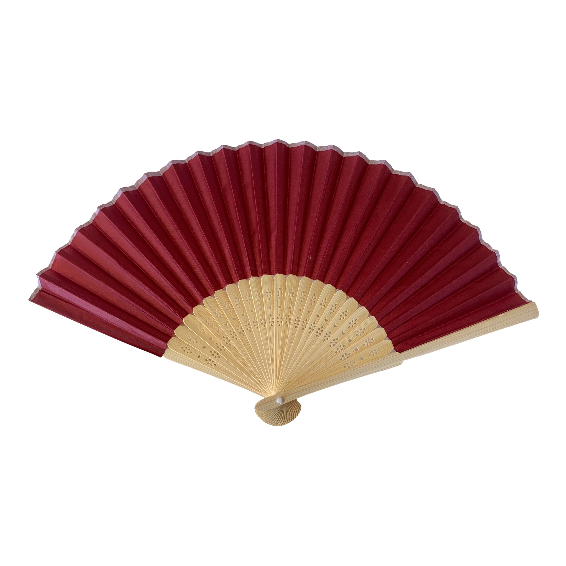 Burgundy Fabric Foldable Hand Held Bamboo Wooden Fan. With 23 Pieces of Bamboo Ribs. Size open: 21cm x 37cm approx. Great for decorations, weddings and summer events to keep cool.