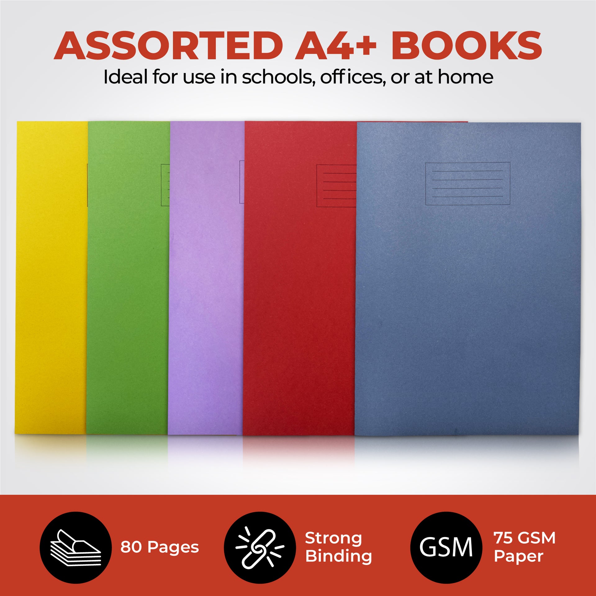 Pack of 10 Janrax A4+ 48 Page Feint Ruled and Margin Exercise Books WF Paper with 225gsm Manilla Cover 240x340mm Workbook. Colours included: Yellow, Red, Green, Dark Blue, Purple. The Janrax A4+ Exercise Book is the ultimate resource for students, teachers, and professionals who need a little extra room alongside traditional A4 tasks. Slightly larger than standard A4 at 240x340mm, this notebook accommodates A4 sheets perfectly, making it ideal for collating documents or archiving worksheets without folding them. It features 48 pages of feint ruled WF paper with margins, offering a structured format for neat, organised note-taking. The quality 75gsm WF paper ensures durability and a smooth writing experience, while the sturdy 225gsm Manilla cover protects your notes and inserted documents from wear and tear. Whether used for taking extensive notes, pasting important handouts, or as a workbook for projects that require additional space, this exercise book is designed to meet a variety of educational and professional needs. It's a perfect choice for anyone who values precision and the convenience of having extra space to work and compile their studies or meeting materials in one place. Choose the Janrax A4+ Exercise Book for a versatile and practical solution to manage your larger paperwork efficiently.