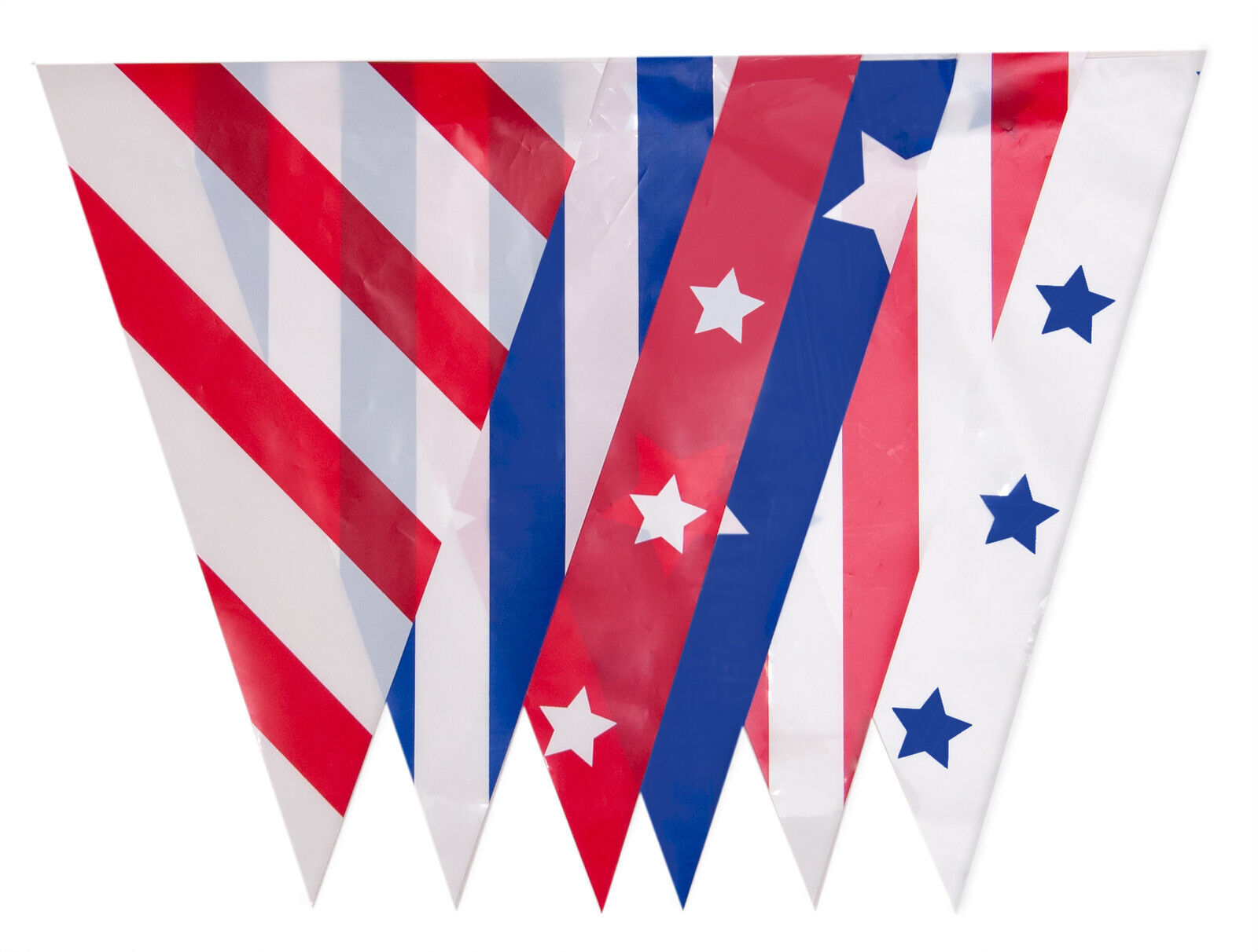 Stars and Stripes Deconstructed Bunting 10m with 20 Pennants. This bunting measures 10m and has 20 pennants. Material: PVC. Approx size of each Flag/ Pennant 30x20cm.