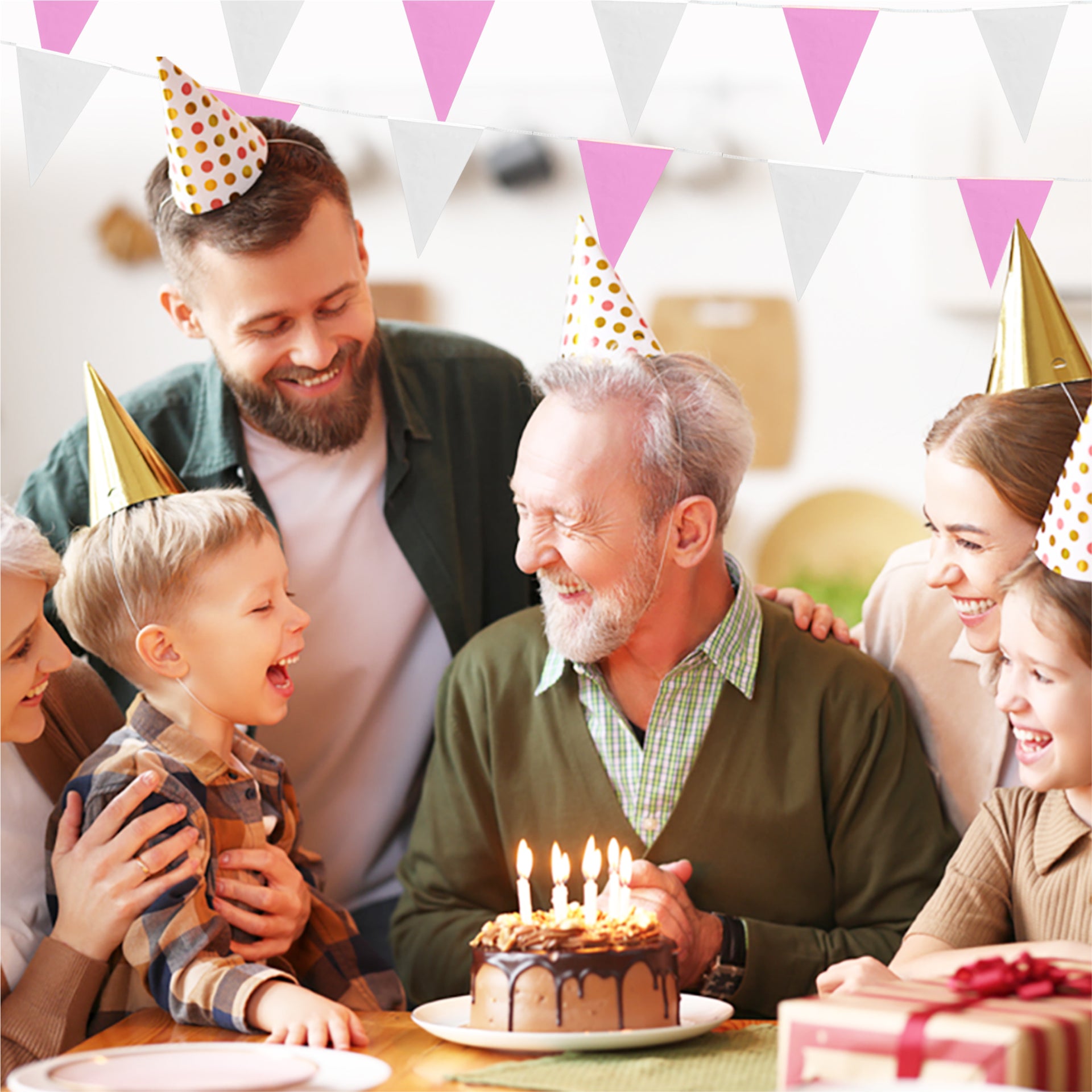 White Light Pink Alternate Bunting 10m with 20 Pennants. This bunting measures 10m and has 20 pennants. Material: PVC. Approx size of each Flag/ Pennant 30x20cm.