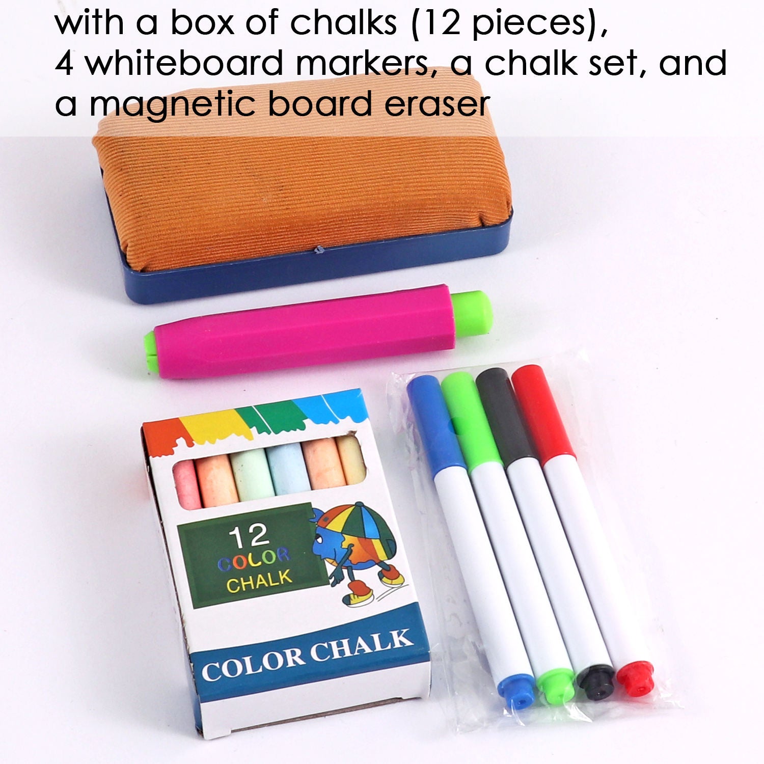 Height Adjustable Folding Wood Easel Kids Drawing Board 47 x 84.5cm. Panel size: 47*7*84.5cm, Height: 60-108cm. Includes a box of chalks (12pieces), 4 whiteboard markers, a chalk set and a magnetic eraser. Introducing our Height Adjustable Folding Wood Easel Kids Drawing Board, a versatile and interactive platform for young artists to explore their creativity. With a panel size of 47 x 84.5cm and adjustable height ranging from 60 to 108cm, this easel grows with your child, accommodating their changing needs and preferences. Crafted from sturdy wood, it provides a stable and durable surface for drawing, painting, and writing activities. The set includes a box of 12 chalks, 4 whiteboard markers, a chalk set, and a magnetic eraser, offering a variety of mediums for artistic expression. Whether it's drawing, practicing letters, or playing educational games, this drawing board inspires endless hours of fun and learning for children of all ages.