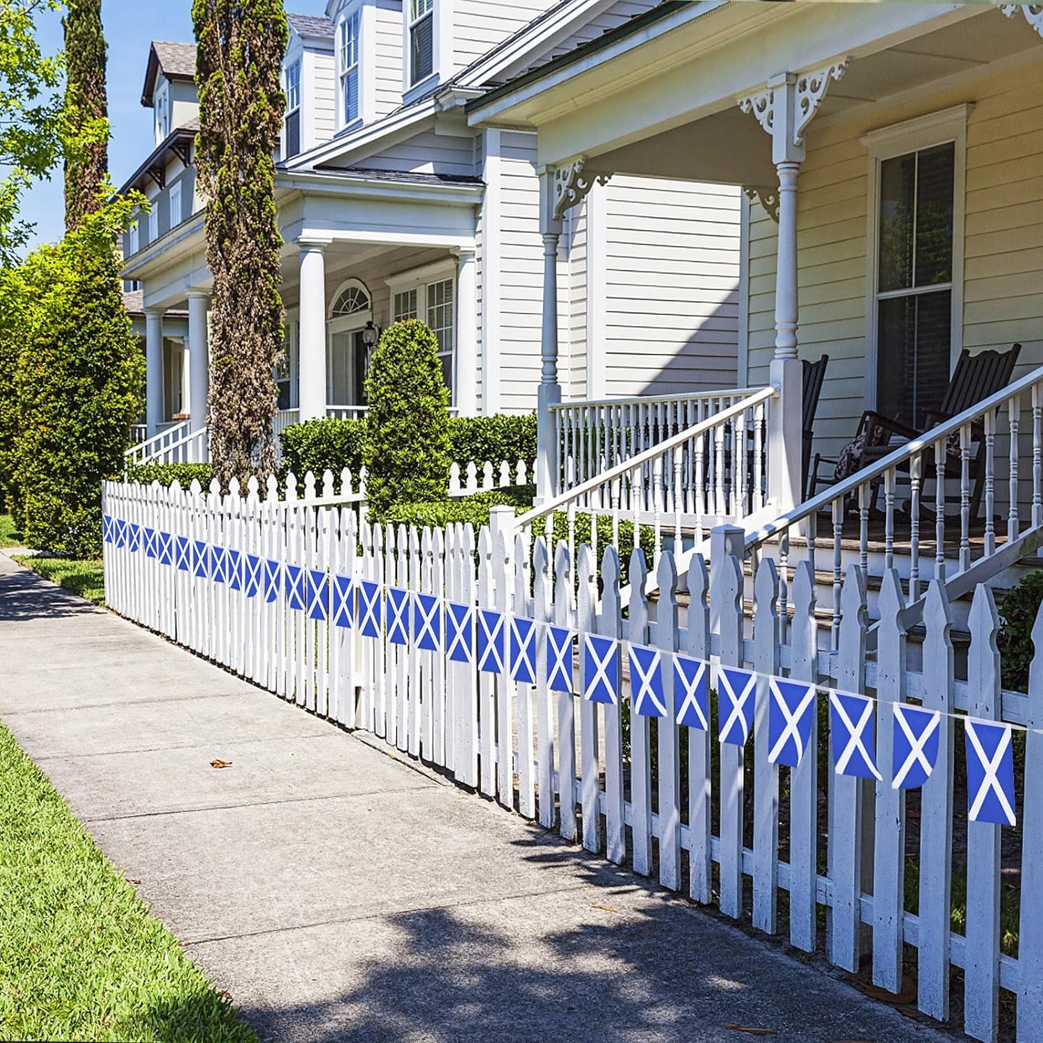 Scotland Rectangle Bunting 10m with 20 Flags. This bunting measures 10m and has 20 pennants. Material: PVC. Approx size of each Flag/ Pennant 30x20cm. Introducing the vibrant and versatile Bunting 10m with 20 Pennants, a delightful addition to any celebration or decorative endeavor. This charming bunting boasts a length of 10 meters, providing ample coverage to adorn various spaces with whimsical flair. Crafted with high-quality, durable materials, each of the 20 pennants is designed to withstand outdoor elements, making it suitable for both indoor and outdoor use. Whether you're hosting a festive gathering, sprucing up a garden party, or adding a pop of color to a room, this bunting is sure to captivate attention and evoke a sense of joy and celebration. With its eye-catching design and array of vibrant colors, it effortlessly infuses any setting with a playful and festive atmosphere. Ideal for birthdays, weddings, graduations, or simply adding a touch of charm to everyday life, the Bunting 10m with 20 Pennants offers endless possibilities for creative expression. Hang it along fences, walls, ceilings, or across outdoor spaces to instantly transform any environment into a visually stunning spectacle.