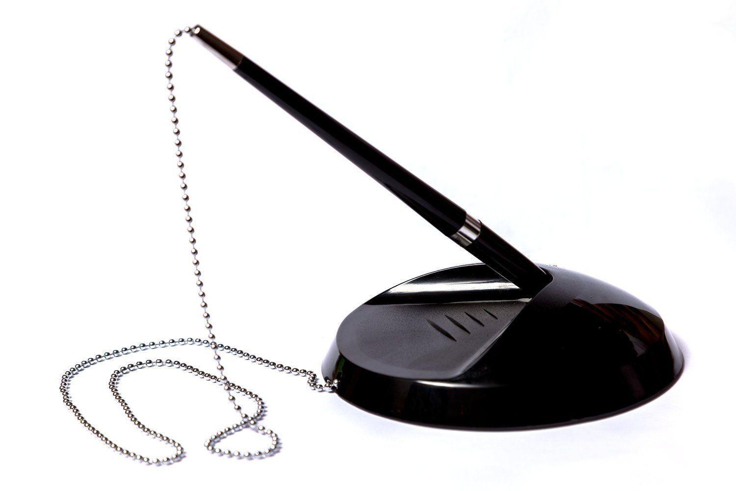 Janrax Black Reception Pen with Chain. Durable metal chain to keep pen secure. Includes pealable sticky base to stick to surfaces if required. Ballpoint Pen with Black Ink. Replacable Black and Blue refills available in the Janrax Range.