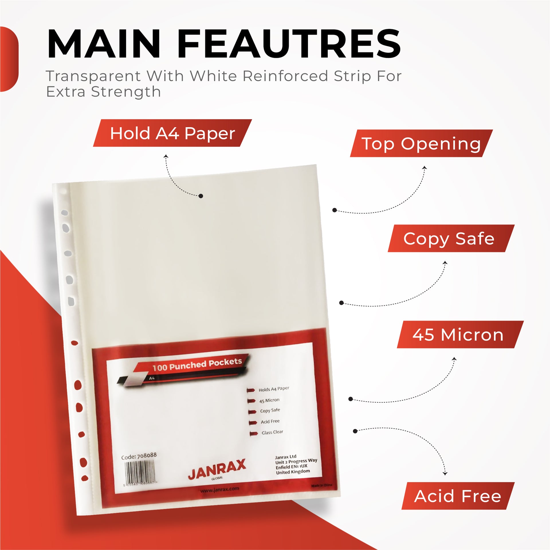 Pack of 50 A4 Red Punched Pockets by Janrax