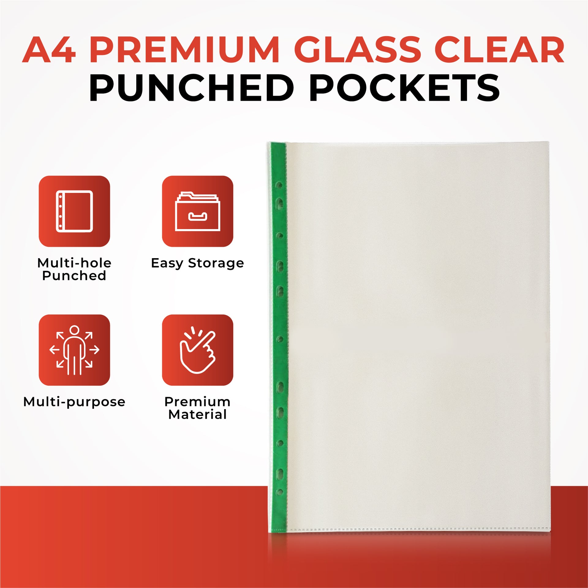 Pack of 100 A4 Premium Glass Clear Punched Pockets (90 Micron) - 708099