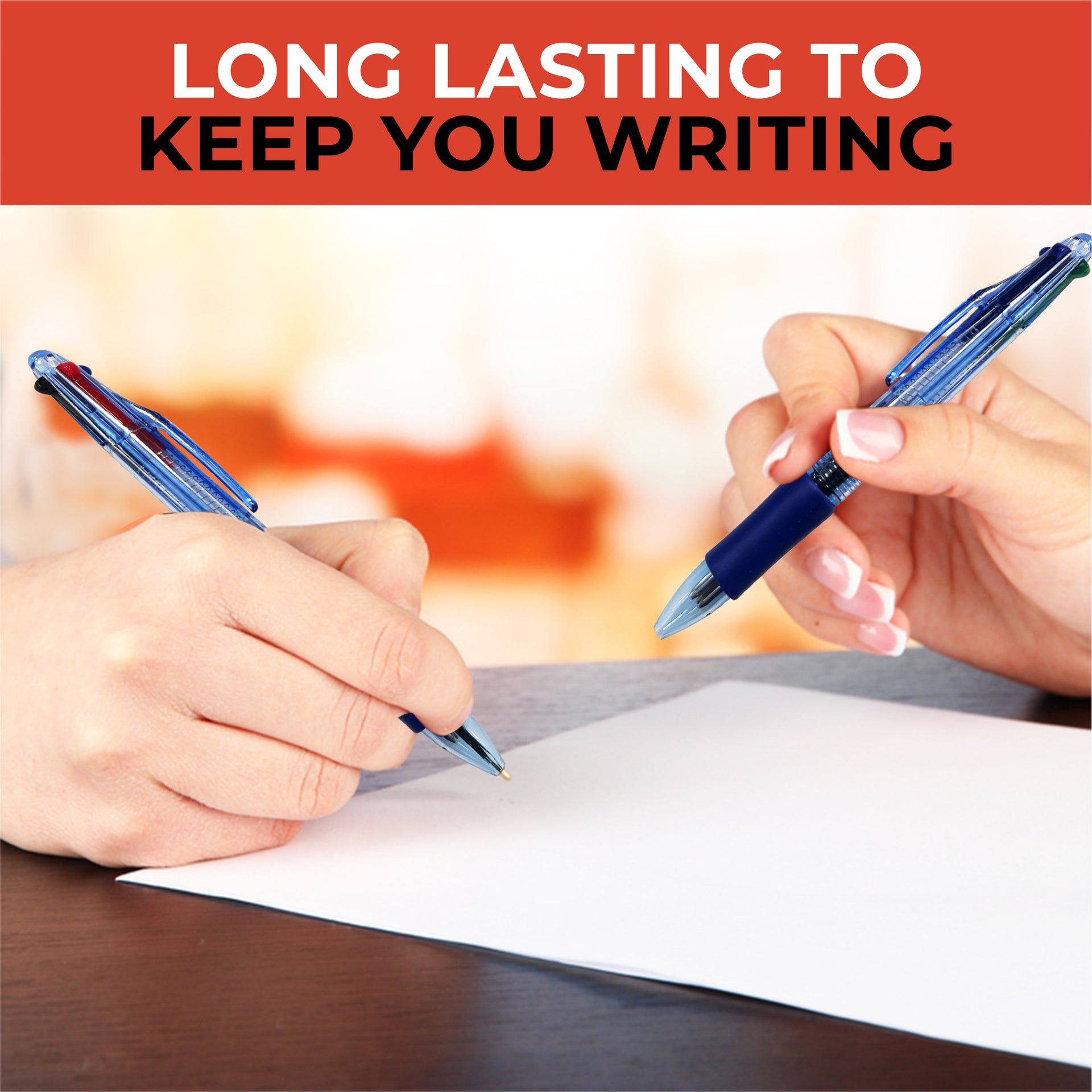 Pack of 12 4 Colour Ballpoint Pens by Janrax. Change ink colour at the push of a button with this retractable 4 Colour Ball Point Pen. Choose between black, blue, red and green ink for a multitude of writing tasks. Ergonomic barrel with a rubber grip for comfort. 1.0mm nibs writes a 0.5mm line width.The ball point nibs provide a smooth writing experience and the retractable design prevents the ink drying out.