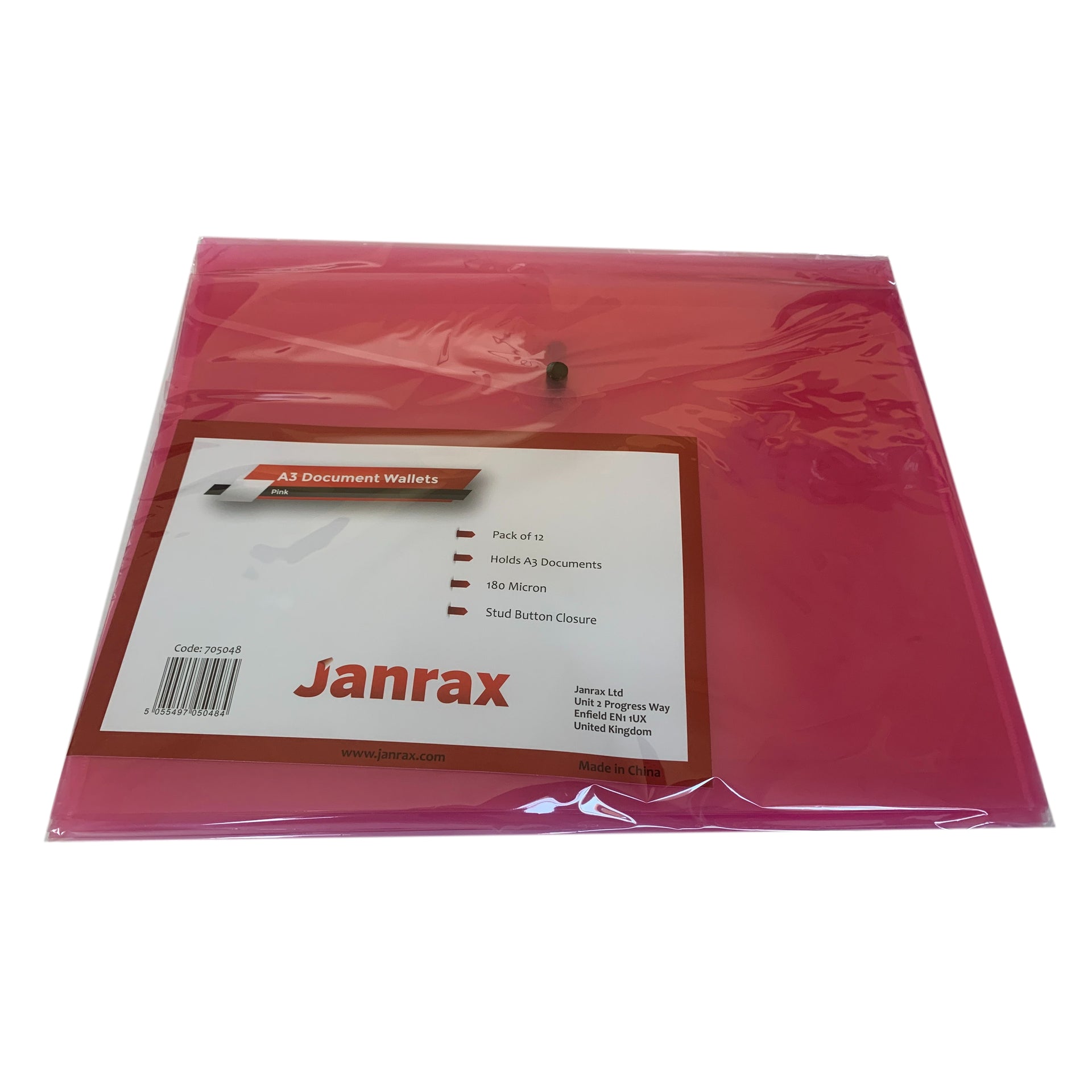 Pack of 12 Janrax A3 Pink Document Wallets - Button Stud Folder